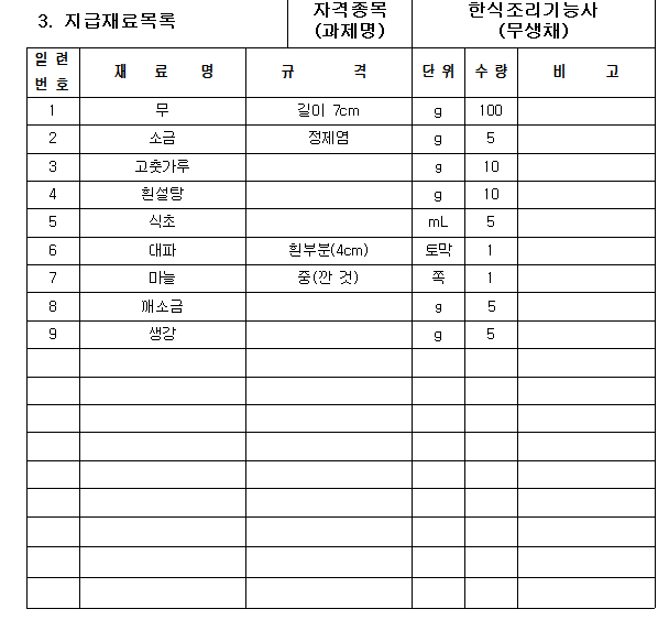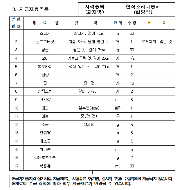 * 필기시험의 경우 생소한 용어들이 많아 기출문제를 많이 풀어봐야 합니다. 한식 조리 기능사 실기 시험은 위 시험 문제와 같이 요구 사항의 내용과 지급된 재료로 과제를 제한 시간 내에 만들어 내는 작업이 필요로 하며 위생상태 및 안전관리 조리 기술 등 요리 완성도를 평가하게 됩니다.