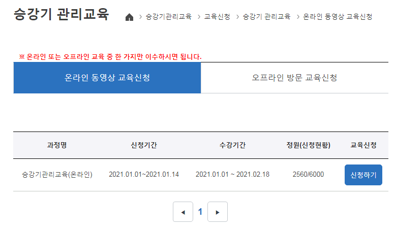 * 아까 언급해드린 한국승강기 관리 교육 사이트에 접속하셔서 신청하시면 됩니다. 회원가입을 통해 로그인하셔서 교육신청하시기 바랍니다. 2가지 교육방법이 있지만 요즘 코로나 19로 인해 온라인 동영상 강의로 많이 하는 추세이므로 꼭 동영상 강의를 들으시길 바랍니다.